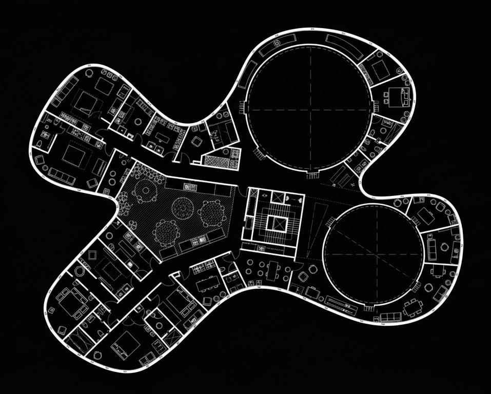 CONTAINS BEDROOMS AND SMALL WORKSPACES DESIGNED WITH ACOUSTIC AND VISUAL SEPARATION BUT CONNECTED THROUGH CURVED PARTITIONS. WINDOWS AND SKYLIGHTS FOLLOW SOLAR ANGLES, OPTIMIZING PASSIVE DAYLIGHT.