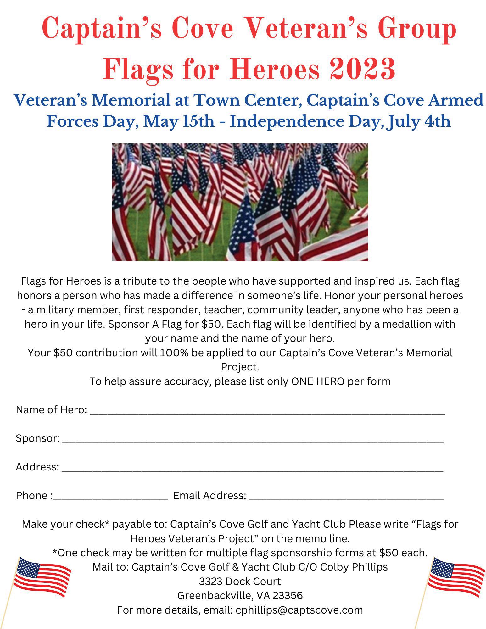 Coming events in Captain’s Cove include a kids Mother’s Day craft event on Saturday, May 6, from 1:30-3:30 p.m. in the Town Center Community Room, an added outdoor Yoga session on May 6 at 8 a.m. at the Marina Club deck, Flags for Heroes at the Veterans Memorial at the Town Center on May 15, and annual golf cart inspections May 6, May 27 and June 10 from 10-11 a.m. at the Marina Club.