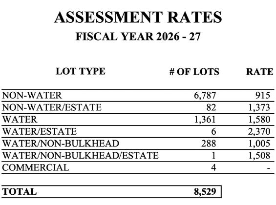 Viola also addressed what he described as “high-cycle” years, during which bulkhead and road expenditures spike before declining again. He said the association’s goal is to balance those cycles over time so reserves are available when needed without creating sharp assessment increases in any single year.