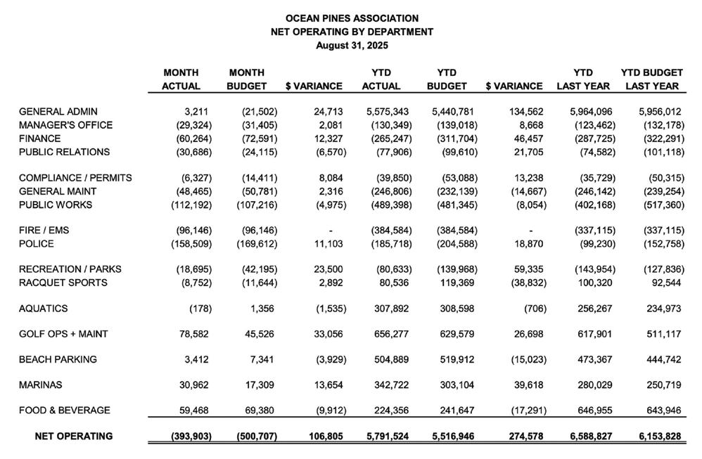 The Ocean Pines Association closed August with another month of favorable financial results, finishing $106,805 ahead of budget for the operating fund. Year-to-date, the community stands $274,578 favorable, continuing a steady pattern of positive performance that has carried through most of 2025.
