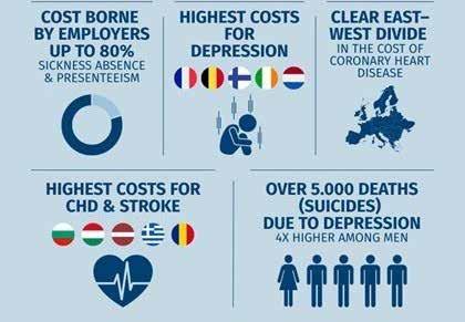 This report is the first to quantify the economic cost of depression, coronary heart disease and stroke, linked to psychosocial work factors. At the EU level, the annual total cost is estimated at €14 billion, with a marked east–west divide: Central, Eastern and Southern European countries bear the highest burden, largely due to a higher prevalence of disease and the substantial economic impact of premature deaths.