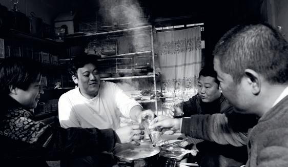 Below: Friends toasting with baijiu