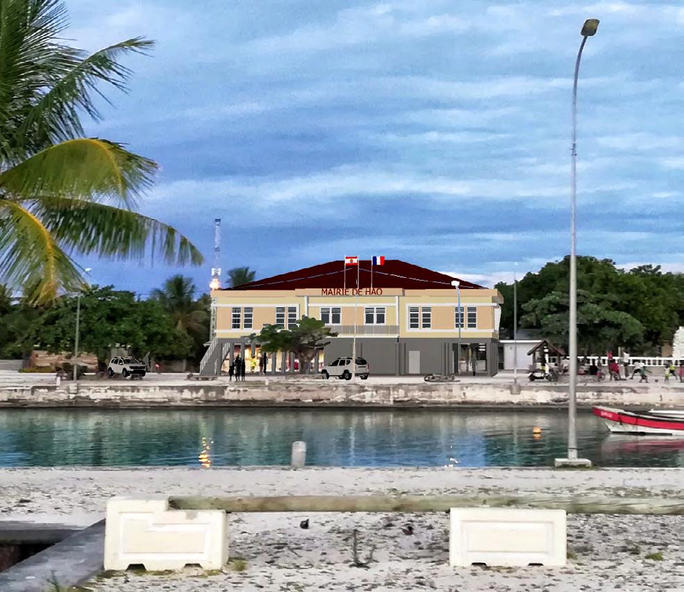 L’abri anticyclonique de l’atoll de Hao est en construction, mais voici une représentation 3D de l’édifice dans le paysage, une fois terminé.