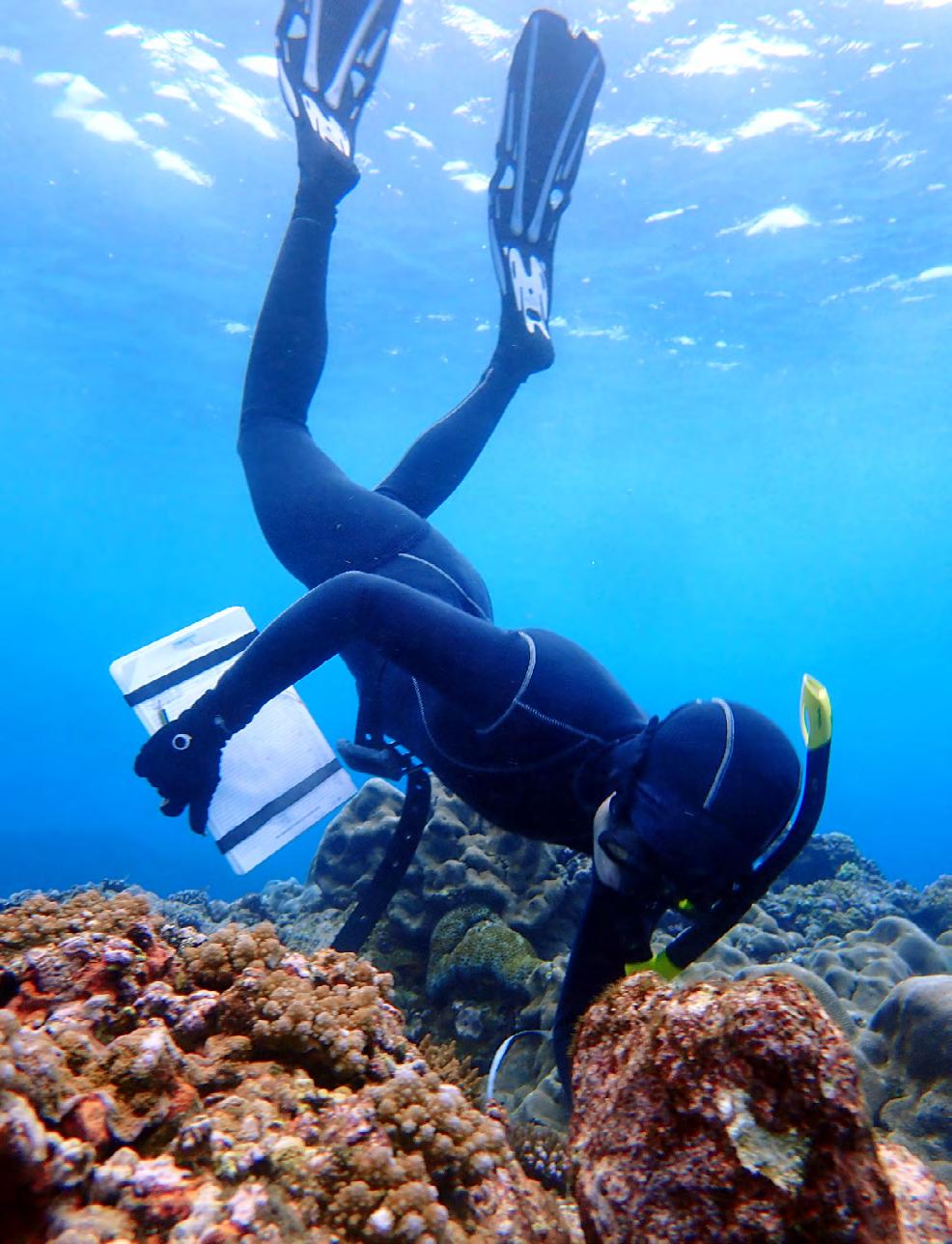 a ctuelle M ent en M i SS ion dan S l ’ archi P el , la biologi S te M arine S andrine j ob a SS ure de P ui S 2019 une S urveillance régulière de S récif S , nota MM ent au S ein du lagon de Walli S, qui Sont SouMiS à de fortS enjeux de P ré S ervation l e P oint S ur S e S ob S ervation S