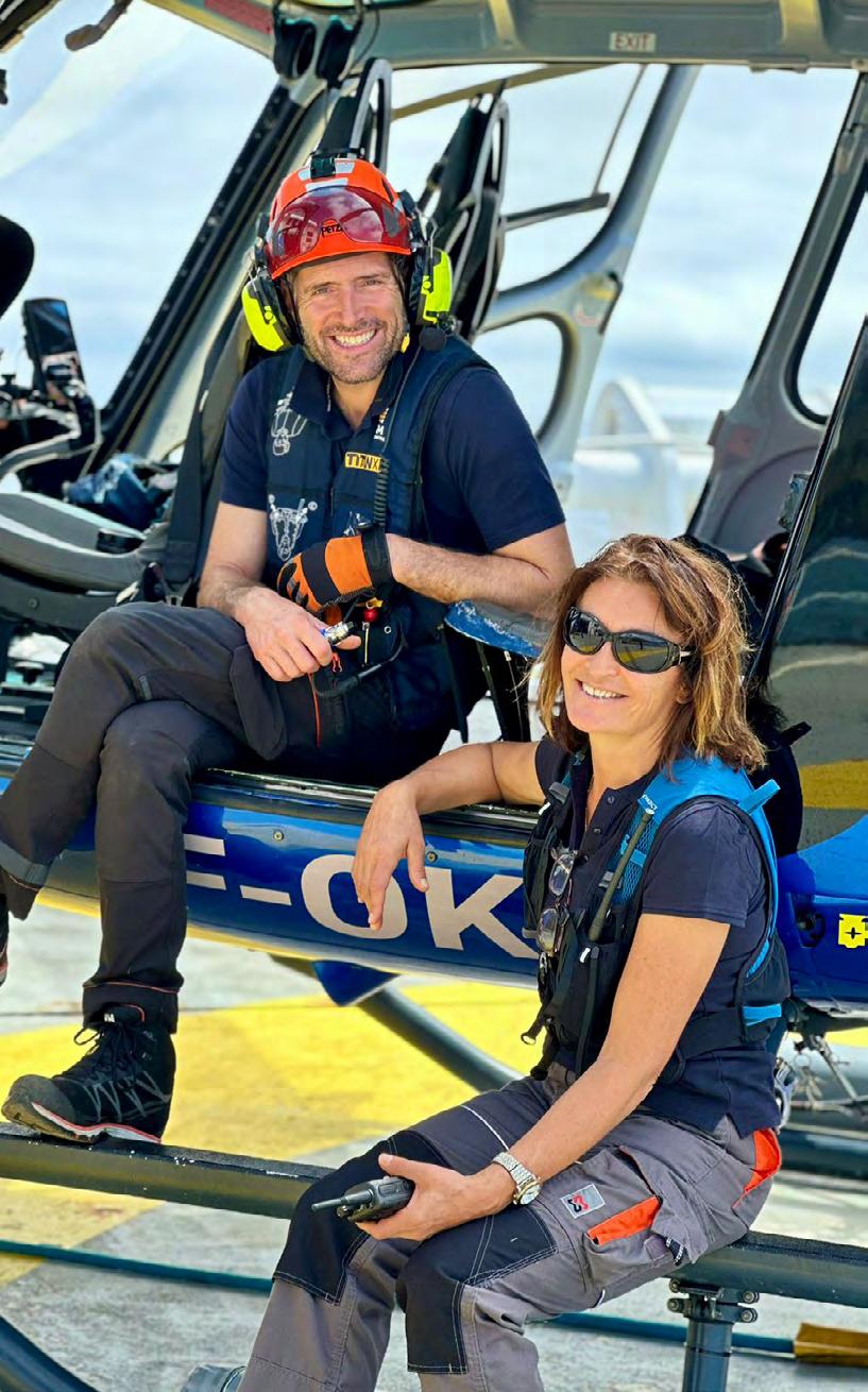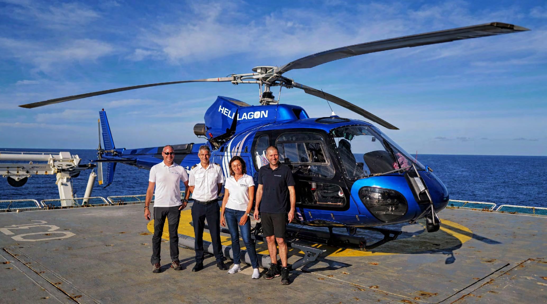 Ci-dessus : entourée de ses collègues, Mariane Benoît est ici sur la « DZ » (Drop Zone) de l’hélicoptère embarqué sur le Marion Dufresne pour effectuer diverses opérations. | Page suivante : Mariane Benoît, en compagnie de Matthieu Picci, mécanicien d’Hélilagon.
