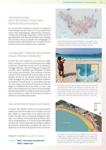 UNE OPPORTUNITÉ POUR LES DÉCIDEURS Le devenir des systèmes côtiers est une préoccupation majeure pour les îles tournées vers le tourisme mais aussi pour réduire les risques côtiers et les impacts des catastrophes naturelles dans un contexte de changement climatique. Une meilleure connaissance des phénomènes d’érosion et d’engraissement sur le littoral de Saint-Barthélemy constitue alors un atout majeur dans les politiques publiques de protection, de prévention, de gestion de crise et leur application par les acteurs de la gouvernance sur le terrain.