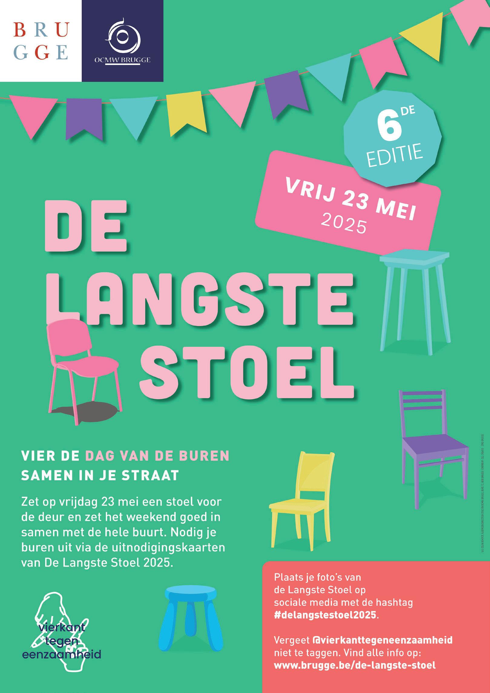 Zet op vrijdag 23 mei een stoel voor je deur en zet het weekend goed in. Hef samen met de buren het glas op een fijne straat of buurt. Gebruik hiervoor de uitnodigingskaarten die je in elk buurtcentrum vindt. Deel je foto’s gerust op sociale media met vermelding van #delangstestoel2025.