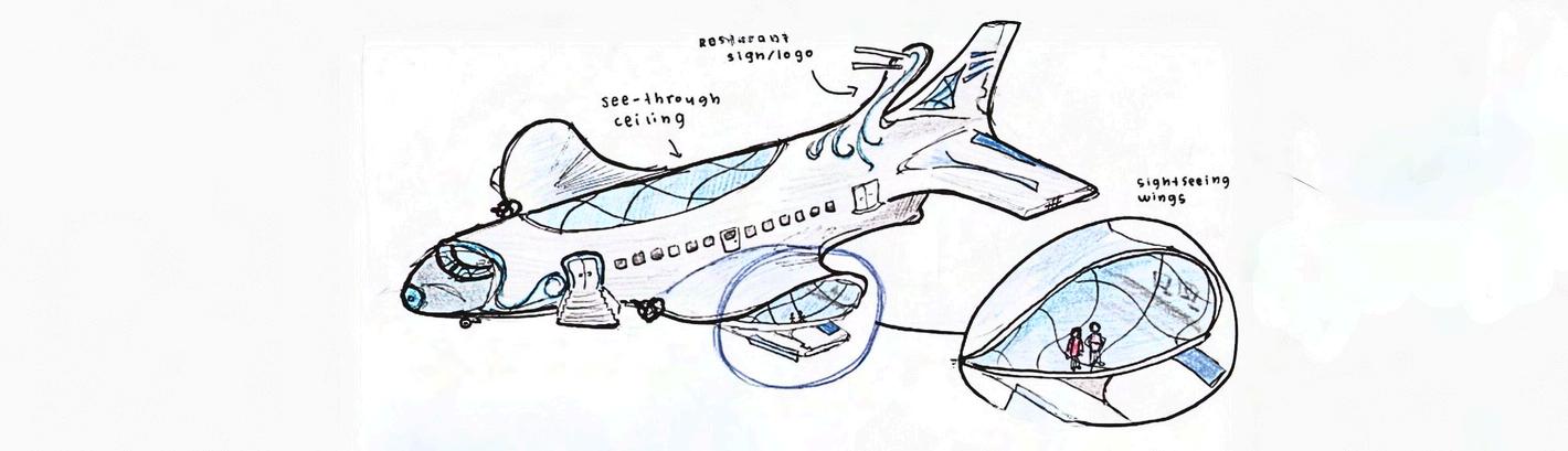 “One day during a particularly boring class, I was thinking about what I should do for this prompt and suddenly I became hungry. I was craving ramen that day and remembered a restaurant that served ichran ramen in booths. It reminded meofthosebusinessclassseatsonaplaneandthat'swhereIgotmyinspiration. Then when I started sketching my plane I realized the front of the plane looked like a rat face and when I was closely examining the window I realized the cockpit should be the kitchen because I had no where else to put it. Then I decided the plane should be a stationary piece of architecture and made the wingsintolargecoolwindows. TheEnd.”