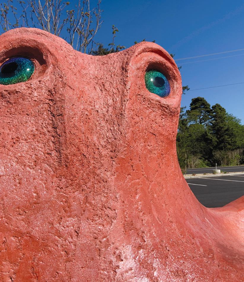 Sculptures, ranging in scale from grand to modest, are scattered around the town. Flamboyant murals bring blank walls vividly to life. There’s a mosaic-bedecked home, a 1930s-era barroom with imaginatively carved woodwork, an assembly of three monumental totems from Korea, a pair of graceful steel archways and “Poppy,” a gracefully towering and kinetic stainless-steel piece that has become an iconic visual feature of Highway 101.