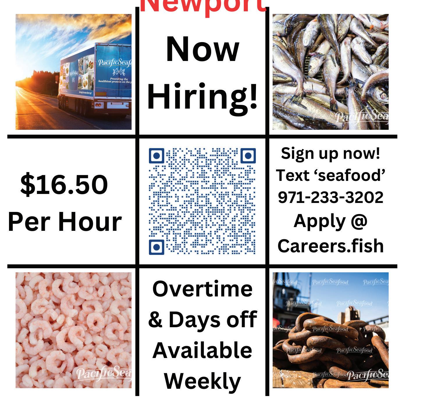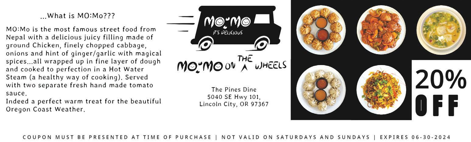 4 • oregoncoastTODAY.com • facebook.com/oregoncoasttoday • May 31, 2024 4 Ask us about private events and catering. The Escallonia Building 304 SE Highway 101, Lincoln City • 541-614-0385 Wednesday-Saturday 3-8 pm Happy Hour 3-5 pm Wood Fired Bistro 34-14 Now serving daily from 6am-3pm Dine in or Take Out Fathoms Restaurant and Bar The Inn at Spanish Head 4009 SW Hwy. 101, Lincoln City 541-994-1601 www.spanishhead.com/fathoms.htm New Management • New Menu New Fathoms! 5040 SE Hwy. 101, Lincoln City www.thepinesdine.com Find us in the Salishan Marketplace 7755 N Hwy. 101, Gleneden Beach 541-764-9026 Dock Workers and Seafood Processors Needed