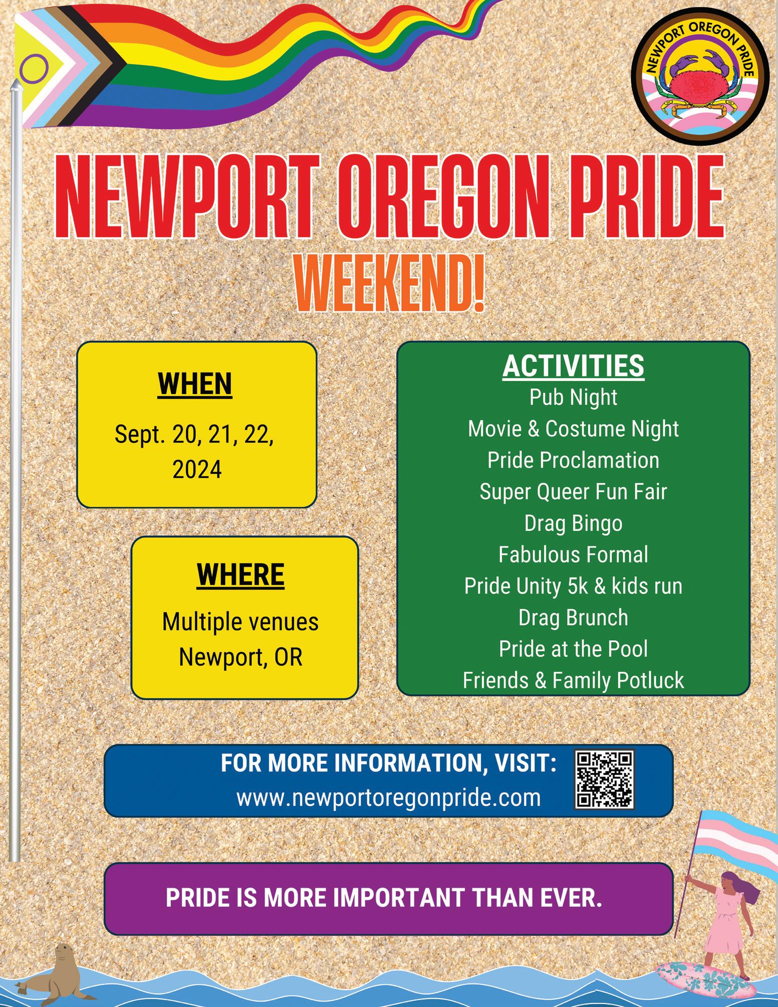 Lincoln City Pride runs from noon to 5 pm at the Lincoln City Cultural Center, located at 540 NE Hwy. 101. For more information, go to lincolncity-culturalcenter.org or call 541-9949994.