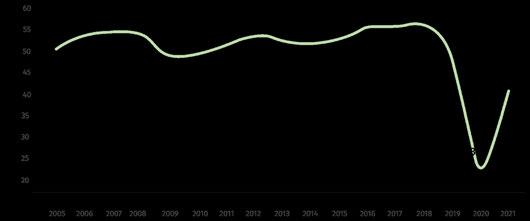 En el 2020 a causa del COVID-19, se perdieron 62 millones de puestos de trabajo, dejando sólo 272 millones de empleados en todo el sector a nivel mundial. Esta disminución del 18,6% ha afectado sobre todo a las pequeñas y medianas empresas, que representan el 80% del total de las empresas del sector (WTTC, 2021).