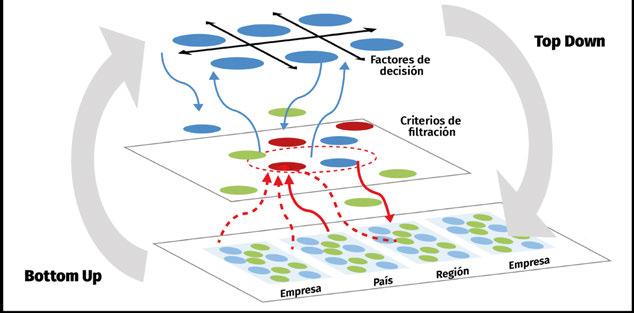 de información precisa para la toma de decisiones. En este contexto, implica agregar valor a los datos y transformar los resultados lineales en información estratégica, a partir de tablas orientadas a los eslabones y necesidades del sector. Tal como lo muestra la siguiente figura, se parte de la construcción de una línea base de información indeterminada, que pasa primero por la construcción de criterios de filtración (Fichas de datos) para dar sentido a los hallazgos. Posteriormente se busca crear con expertos del sector los factores de decisión.