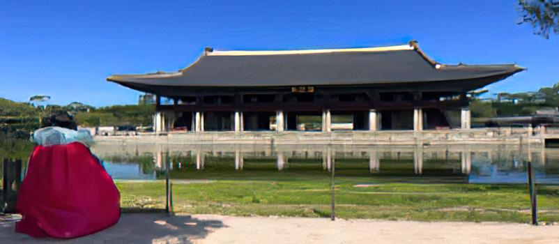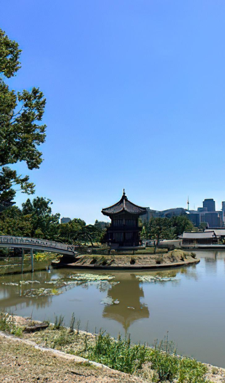 • El Palacio tiene una extensión de 40,5 hectáreas y en su interior tiene un conjunto de lugares y estructuras como el Pabellón Gyeonghoeru, el Estanque Hyangwonjeong y el Museo Folclórico Nacional de Corea, que cuenta con más de 98,000 artefactos que detallan la historia y la cultura coreanas.