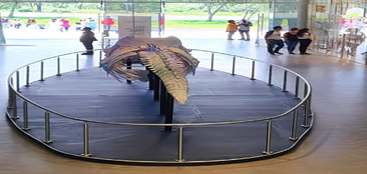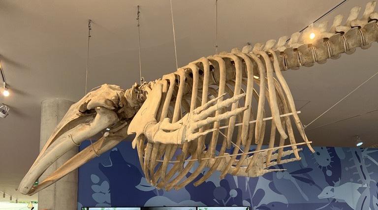 • Por ejemplo, presenta una réplica del esqueleto de un cetáceo suspendida del techo y otro ejemplar sobre una base, que evoca el esqueleto de la ballena jorobada
