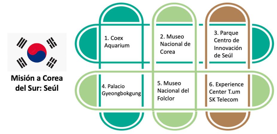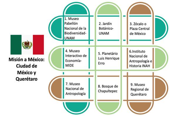Para la realización de las misiones se desarrollaron agendas de visitas específicas para los dos países seleccionados, México y Corea del Sur. Además, se elaboraron cartas solicitando las respectivas visitas para cada una de las instituciones y se creó un formulario electrónico de preguntas para la referenciación, con el objetivo de validar las buenas prácticas en investigación, gestión institucional y transferencia del conocimiento enfocadas en la conservación, preservación y uso del patrimonio natural y cultural. En los siguientes cuadros se presentan la agenda de visitas para cada una de las ciudades seleccionadas para las visitas.
