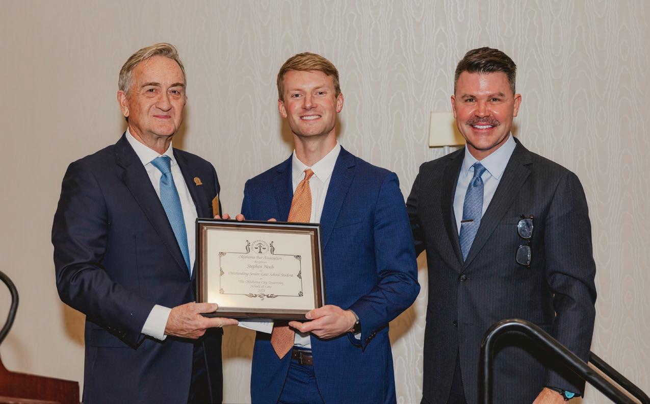 Stephen Hoch ’22 accepts the Outstanding Senior Law Student award from Oklahoma Bar Association president Michael Mordy ’80 and Dean Jim Roth