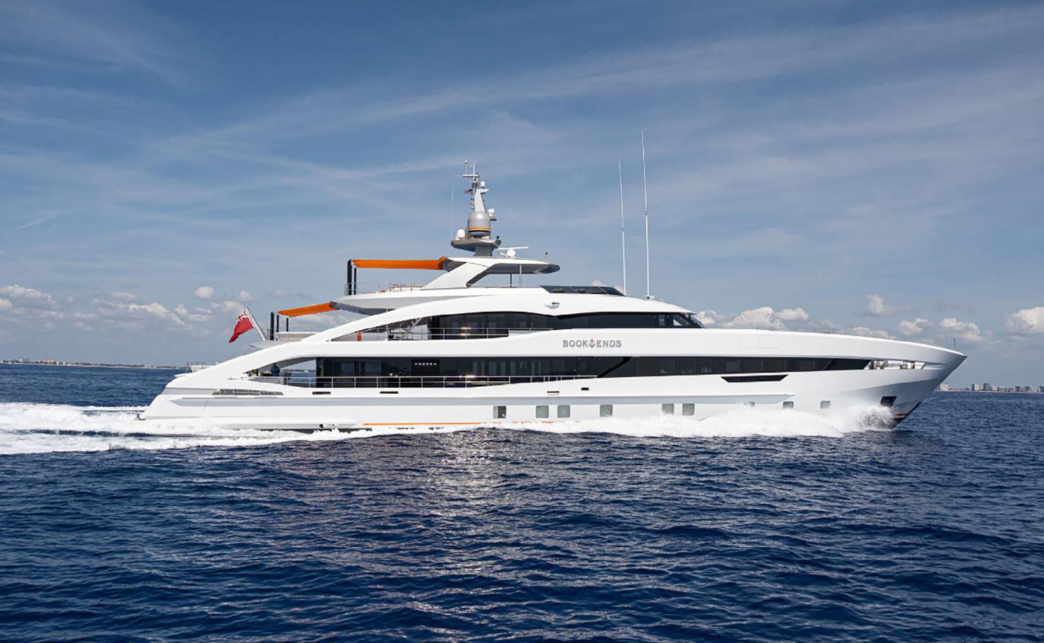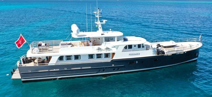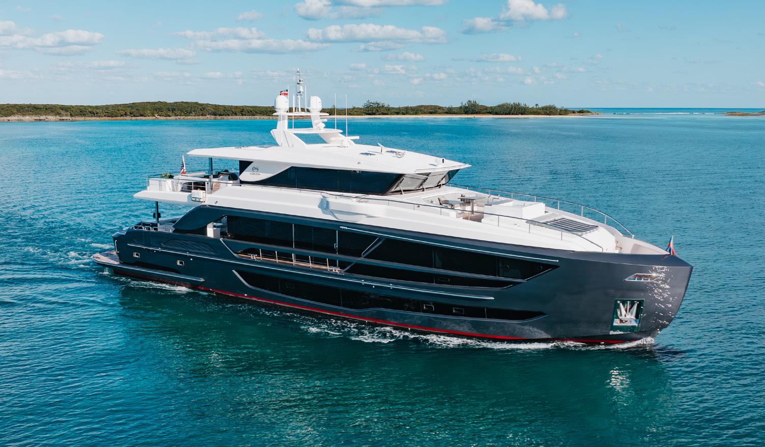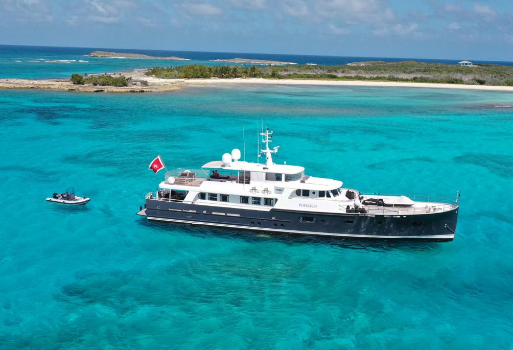 Untethered is a fitting moniker for a yacht whose innovative customisations enable such comfortable exploration. Built by Taiwanese Horizon Yachts and launched in 2021, this adaptable 33m motor yacht is ideal for cruising in the Bahamas but would be equally at home in Monaco or the Norwegian Fjords. One of four FD110 models, Untethered’s exterior design by Cor D. Rover Design lends her metallic grey GRP hull and GRP superstructure a masculine profile. She’s fast, too, with her upgraded twin Caterpillar diesel engines giving her an exhilarating top speed of 21 kn, while a zero-speed and underway stabilisation system ensure a smooth cruising experience. Featuring warm and inviting interiors styled by Horizon, Untethered can accommodate up to 10 guests across five suites. These include a full-beam master suite on the main deck and three guest cabins on the lower deck. With room for a 20ft tender on board; an enclosed sky lounge aft, styled as a gentleman’s club; Jacuzzi on the foredeck, and a custom-made firepit and seating area aft of the bridge deck, there are plenty of opportunities to relax on board. Untethered is the ideal choice for long family charters and exploration adventures.