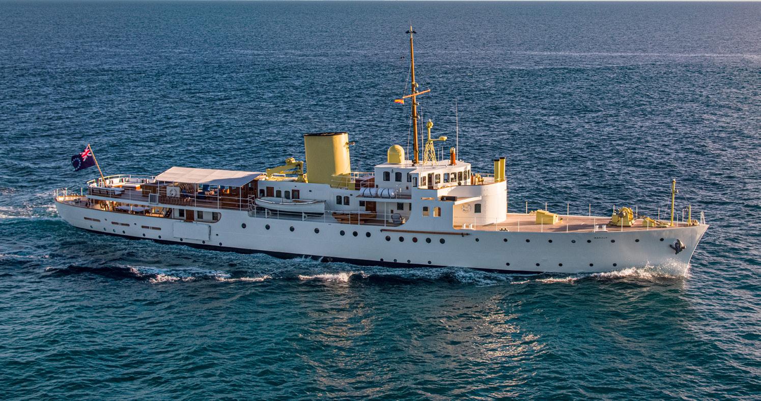 A rare gem, Marala is a 59m classic motor yacht built in 1931 by Camper & Nicholsons, and is one of the few remaining yachts from that era. With a storied past that includes service during World War II and hosting Salvador Dalí, Frank Sinatra, and Amelia Earhart, she now offers summer charters in the Mediterranean. Remarkably, Marala has had few owners over her long history, with her most recent custodian overseeing a meticulous two-year restoration led by Nathan Hutchins of Londonbased Muza Lab. Sensitively honouring her heritage while integrating modern comforts, it earned Marala the Rebuilt Yachts category win at the 2023 World Superyacht Awards. Accommodating up to 12 guests in six elegant staterooms, Marala’s interiors offer a glimpse through her history, from the faithful iterations of original features in room No 388 to the military-inspired Evadne Cabin. Touches of Savoy blue throughout pay tribute to a previous Owner, Princess Maria Gabriella of Savoy.