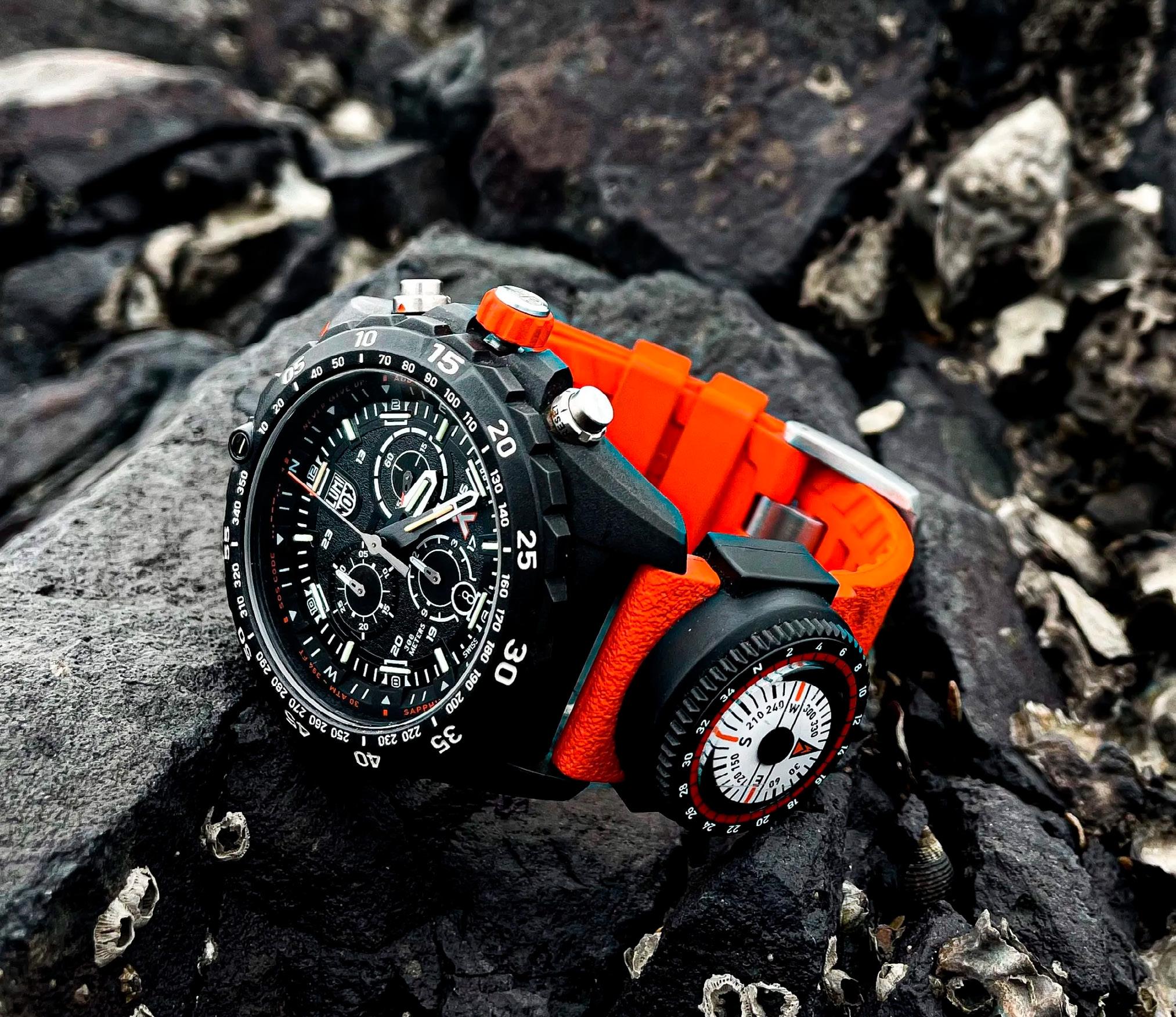 The Bear Grylls Survival Master 3740 chronograph is not just a watch; it's a survival tool engineered for the most demanding environments. Crafted with a 45mm CARBONOX™+ case and uni-directional bezel, this outdoor explorer watch is both ultrarobust and extremely lightweight. The dial, combined with matching hour and minute hands, and sapphire crystal anti-reflective coating, ensures clarity in any situation, while 18 Luminox Light Technology tubes guarantee visibility in all lighting conditions for up to 25 years. Designed with survival in mind, the watch includes an SOS Morse Code reminder on the dial, a detachable compass integrated into the dark grey rubber strap and 300m water resistance. Featuring the Bear Grylls logo on the dial, and Luminox’s signature orange screw-in crown, the Swiss-made Survival Master is a distinctive timepiece. On the reverse of the watch case, Grylls’ galvanising motto, “Never Give Up” is engraved in bold orange, serving as a constant reminder of the resilience and determination that define Bear Grylls’ survival philosophy. A true adventurer’s watch.