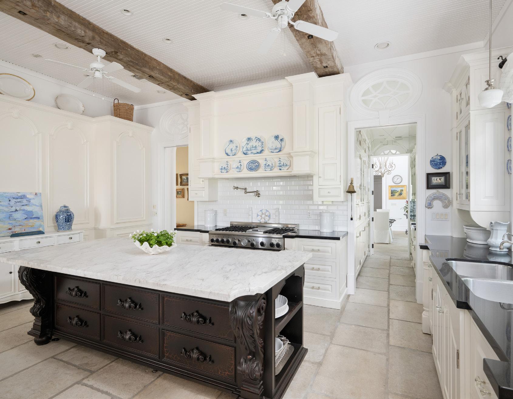 • Butler's Pantry with White Farm Sink and Custom Elliptical Windows Over Custom Designed Pocket Doors Separating Kitchen and Pantry