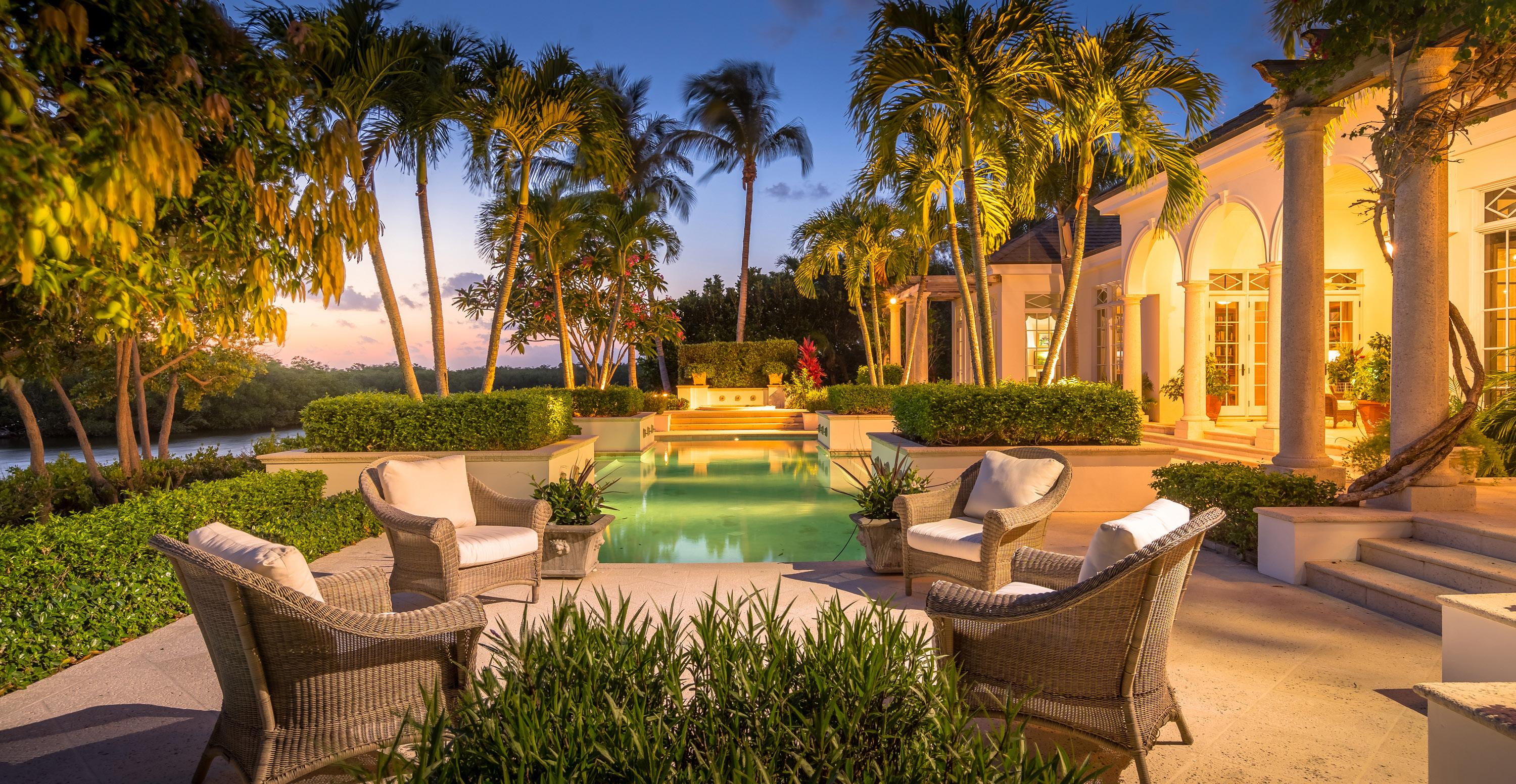 • Pool and River Views Across Lanai with Cast Stone Flooring and Paris Ceramic Capuchon