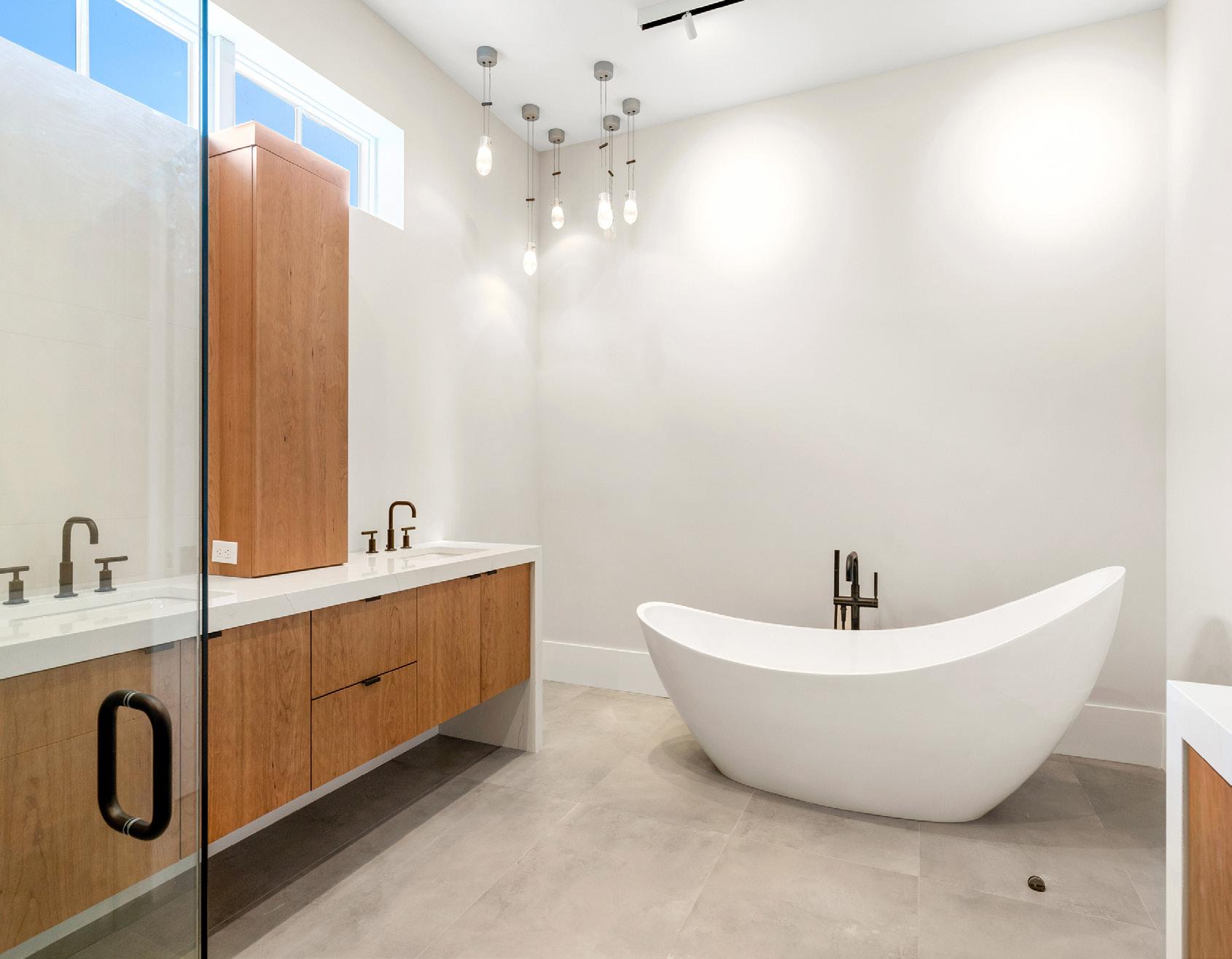 • White Soaking Tub with Matte Black Kohler Tub Filler