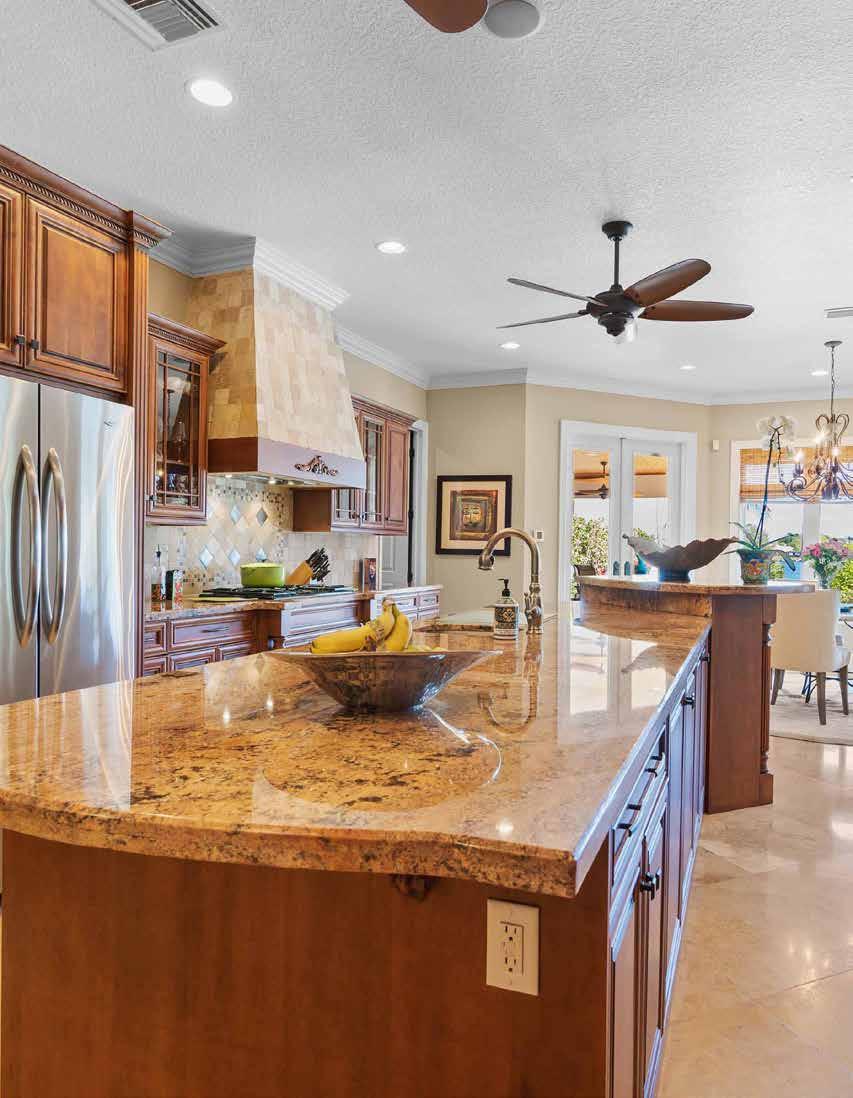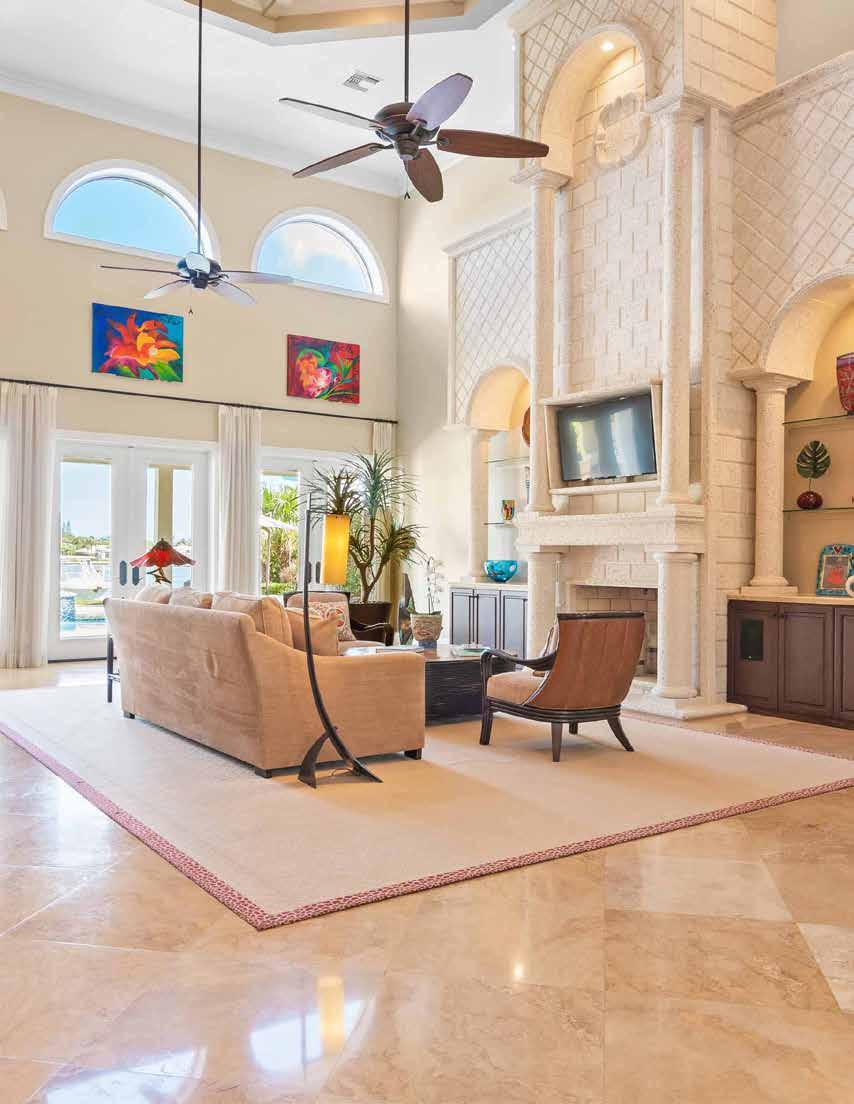 Towering 20 foot ceilings, bar, and floor-to-ceiling coquina fireplace flanked by built-ins in the great room. Expansive gourmet kitchen.