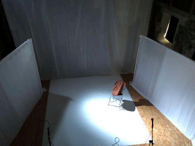 À jardin en avant-scène sont disposés les maquettes qui seront filmées pendant le spectacle ainsi qu’une table de régie pour la vidéaste.