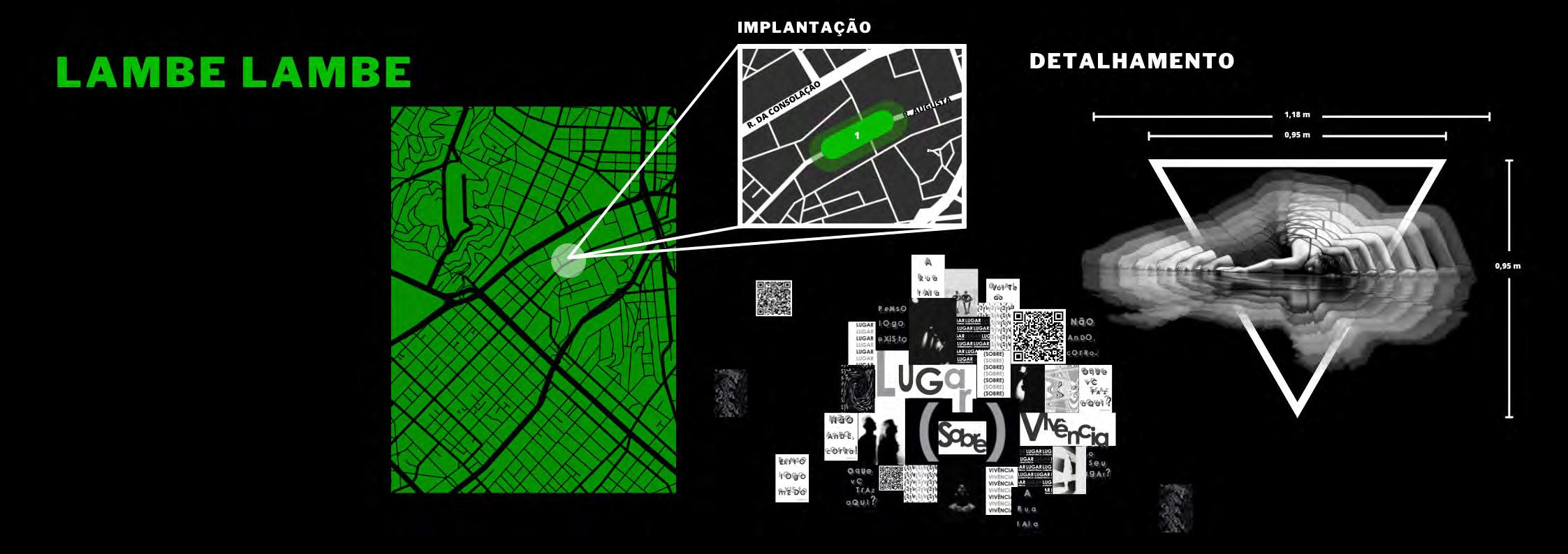 O coisa mais importante dos lambes serão as respostas que incitarão em cada um, nem que não externalizem, mas são mensagens que plantam a diferença, plantam a semente da dúvida, da curiosidade de descobrir a si . Com três tipologias de Lambe Lambe (A4 - 210 x 297mm; A3 - 297 x 420mm ; A0 1682 x 2378mm). A intervenção, assim como a proposta do lambe lambe, foi introduzida em paredes e fachadas vazias no decorrer do Baixo Augusta.