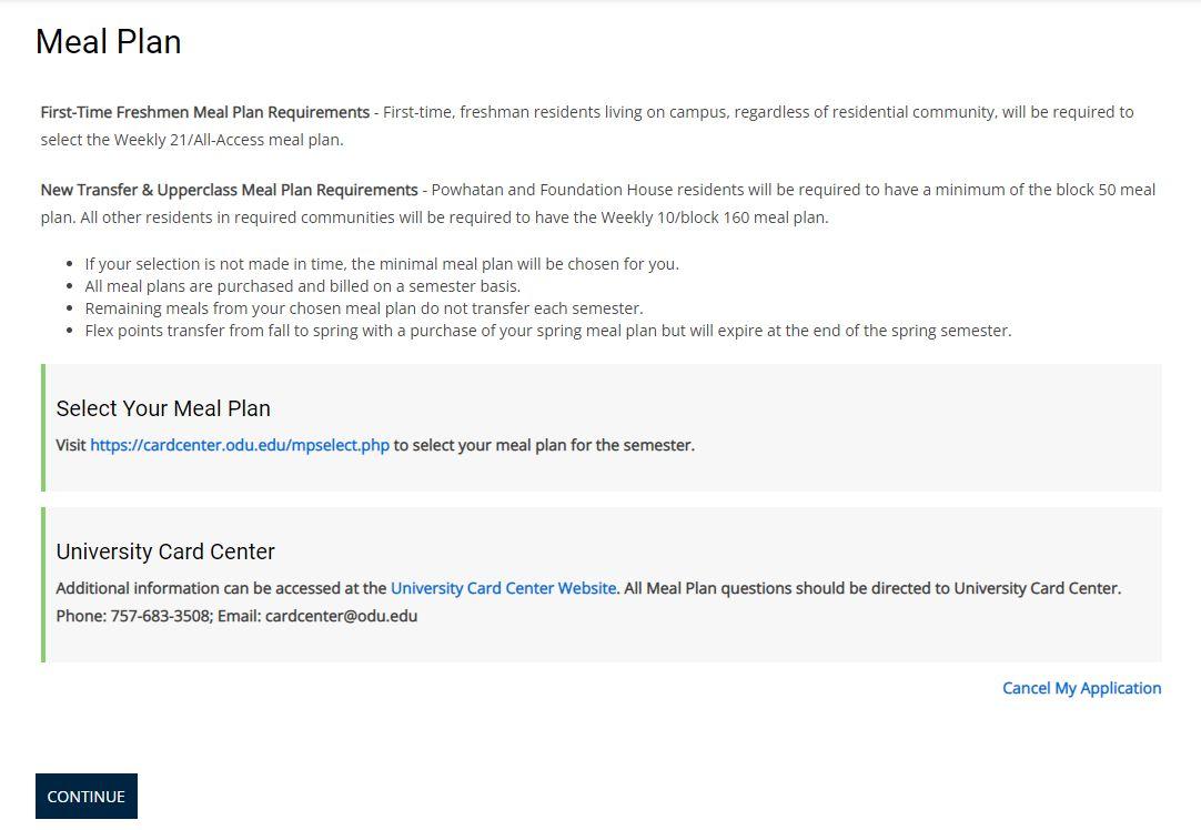 ▪ Once you have received a Housing Assignment, you will be prompted to select a Meal Plan via the provide link.