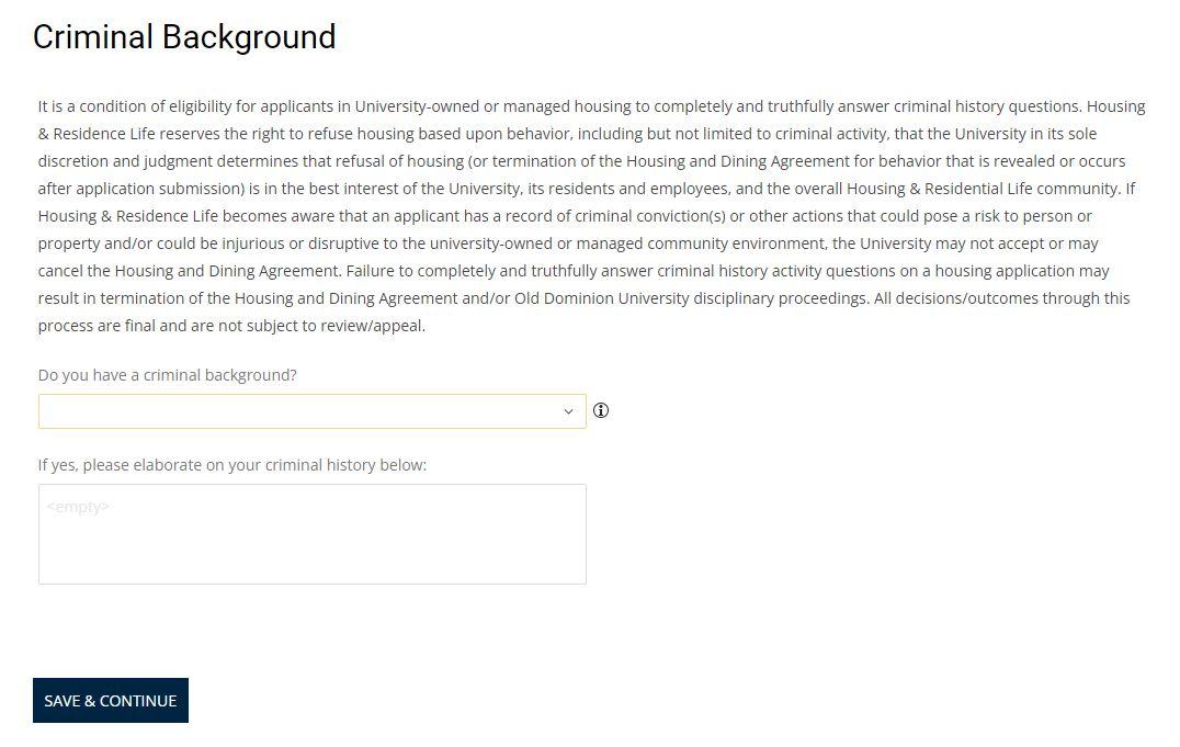Educational Accessibility Accommodations ▪ Indicate whether you have a disability that will impact your ability to live within the residential community ▪ Click “Save & Continue”