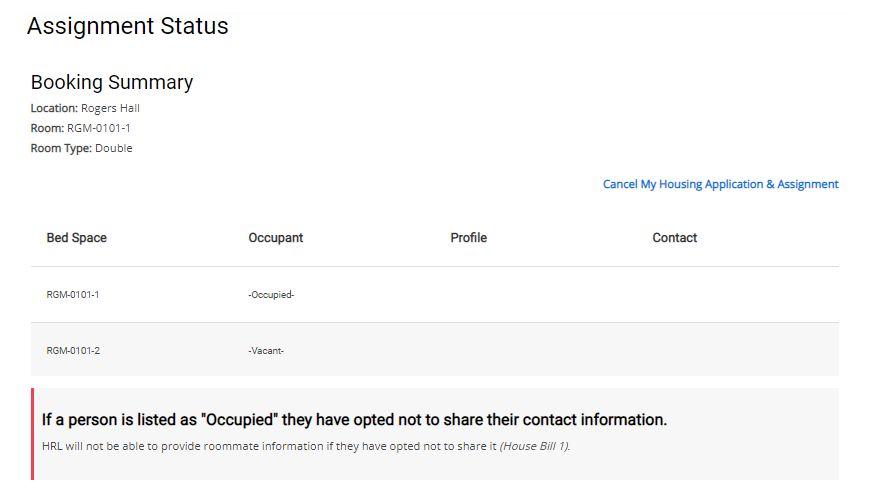 ▪ Additionally, roommate information will be present on this page. If a resident opts not to share their information, the space will show as “Occupied” without student information present