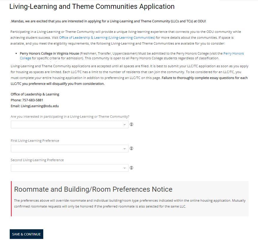 ▪ Review Living Learning Community options provided. The Honors College options is available in the drop down. ▪ Select two (2) LLC/TC Preferences ▪ Click “Save & Continue” to proceed