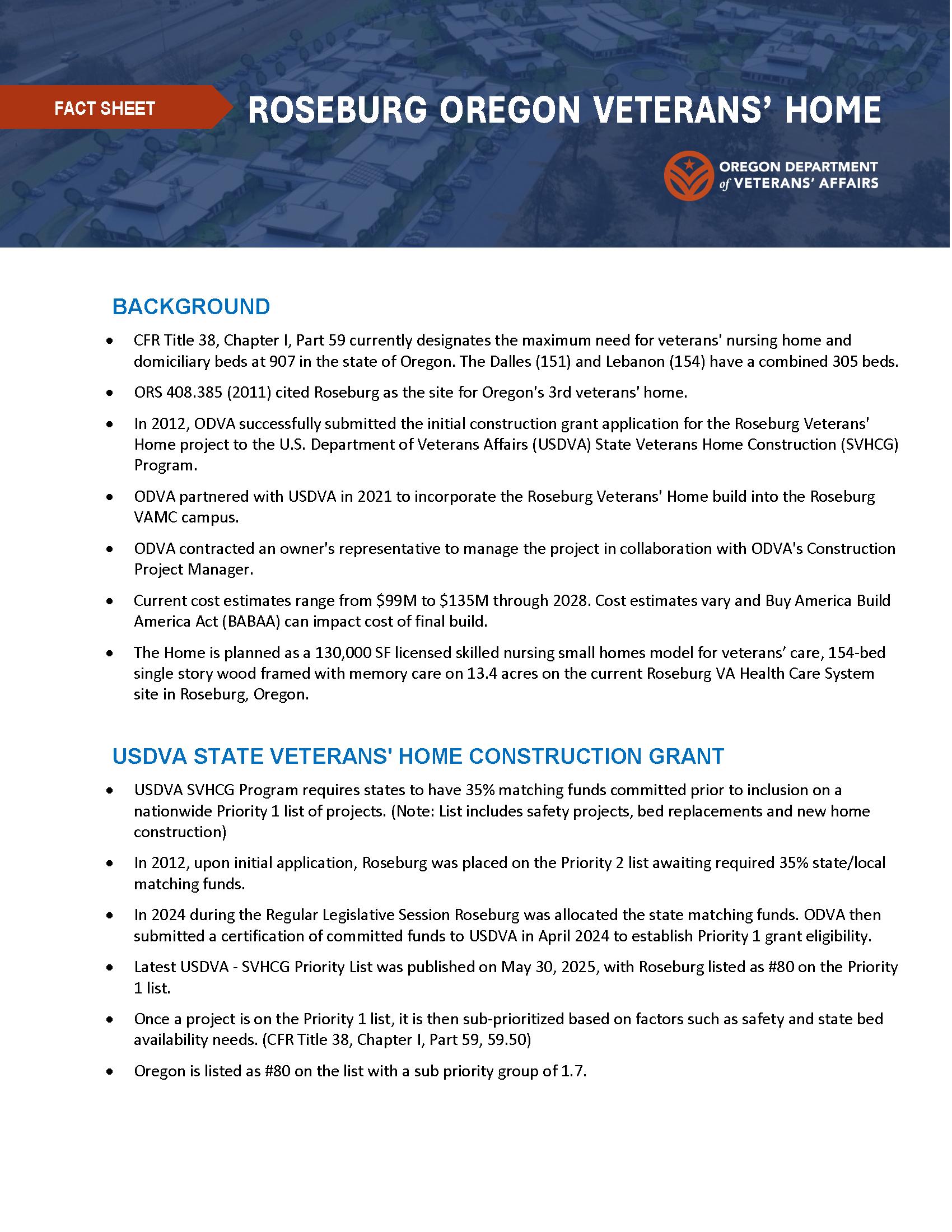 a. Roseburg Veterans’ Home Project Update – Dr. Nakeia Council Daniels