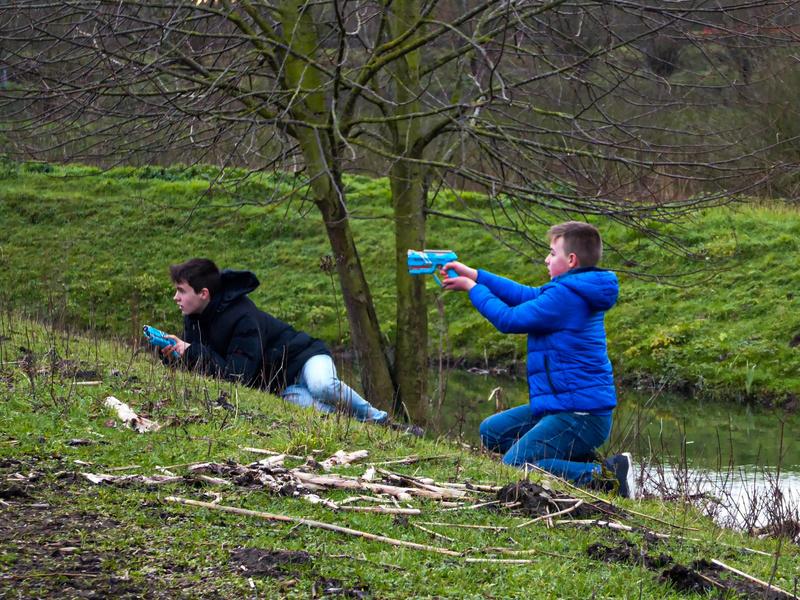 Alle spelers worden verdeeld over het speelveld en krijgen een willekeurig wapen mee. Zorg er wel voor dat er van elk team evenveel wapens zijn. Op het startsignaal mogen de spelers elkaar beginnen afschieten totdat er maar een speler of ploeg overblijft. Verklein elke vijf minuten het veld. Je kan dit eenvoudig doen met stukken touw of afbakenlint. Als een speler buiten het veld terechtkomt, is hij ook direct dood.