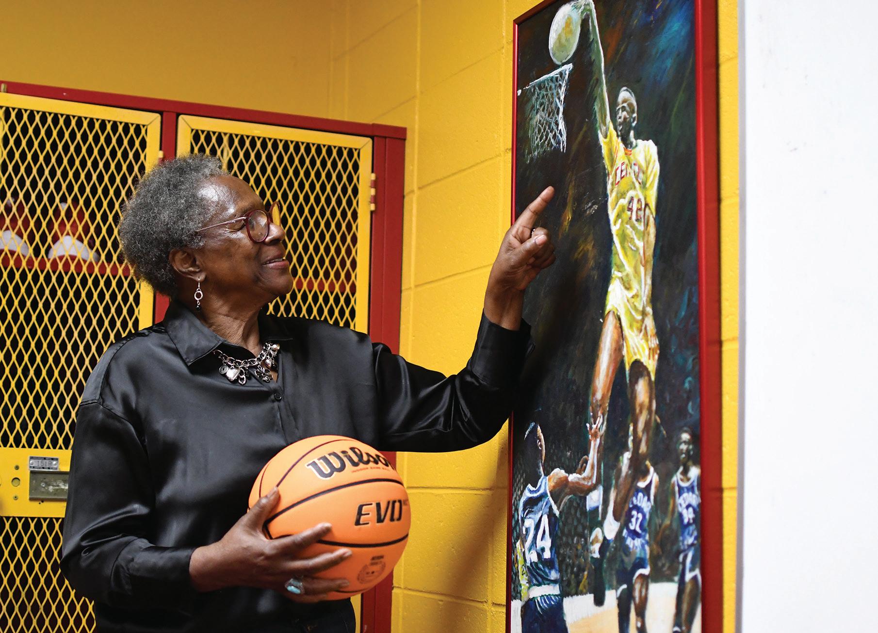 Above: A LIVING LEGEND: Geneva Johnson Eberhart, Athens community member and mother to Clarke Central High School Class of 1992 alumnus and former varsity basketball player Percy Eberhart, points at a painting of her son’s likeness displayed in the CCHS boys varsity basketball locker room. According to Geneva, Percy had starry-eyed dreams that became intertwined with the history of the CCHS basketball program. “(Percy) wanted to play against Shaquille O’Neal. He said, ‘Mom, I want to play against him.’ I said, ‘That big ole’ boy? Are you crazy?’ He said, ‘No, I just want to play against him, and I think I can,’” Geneva said. “Right before he died, he was scheduled to go to Texas and try out with (Charles) Barkeley, Shaquille (O’Neal), Scottie Pippen, but he never did make it there.” Photo by Aza Khan
