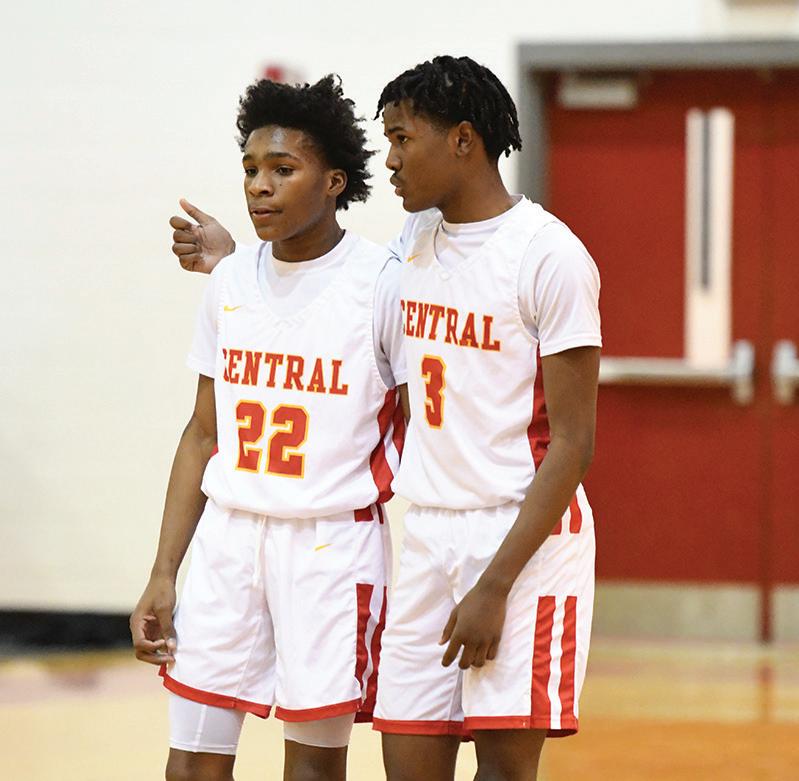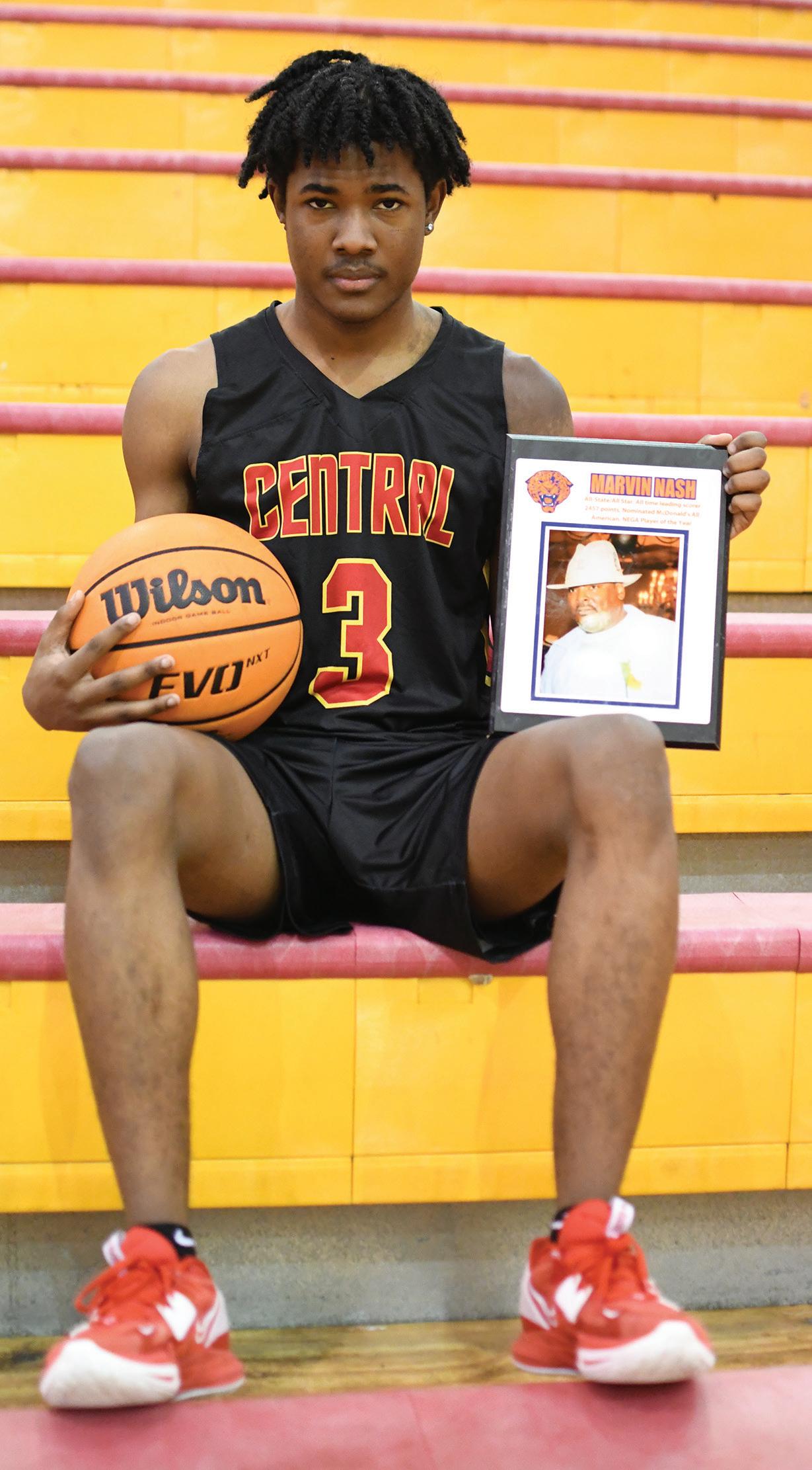 Left: A WINNING TRADITION: Clarke Central High School head boys varsity basketball coach Dr. Stefan Smith coaches during the Gladiators’ game against Seckinger High School on Nov. 29, 2023. Smith’s former teammate, Class of 1992 alumnus Percy Eberhart, died in 1993, leaving Smith to retell Percy’s exploits. “(His numbers) give other people stuff to shoot for (and) goals to have,” Smith said. “I like (the team now) to take pride in who they’re playing for and the school and the (CCHS) tradition.”