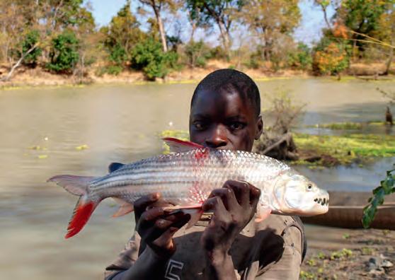 L.:EinjungerFischer präsentierteinen seltenenafrikanischen Tigerfisch. R.: Traditionelles FischenmitNetz.