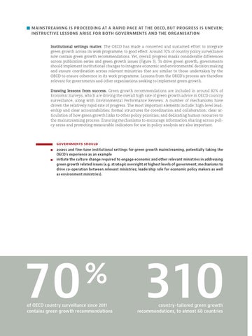 Mainstreaming is proceeding at a rapid pace at the OECD, but progress is uneven; instructive lessons arise for both governments and the Organisation Institutional settings matter. The OECD has made a concerted and sustained effort to integrate green growth across its work programme, to good effect. Around 70% of country policy surveillance now contain green growth recommendations. Yet, overall progress masks considerable differences across publication series and green growth issues (Figure 3). To drive green growth, governments should implement institutional changes to integrate economic and environmental decision making and ensure coordination across relevant ministries that are similar to those undertaken by the OECD to ensure coherence in its work programme. Lessons from the OECD’s process are therefore relevant for governments and other organisations seeking to implement green growth. Drawing lessons from success. Green growth recommendations are included in around 82% of Economic Surveys, which are driving the overall high rate of green growth advice in OECD country surveillance, along with Environmental Performance Reviews. A number of mechanisms have driven the relatively rapid rate of progress. The most important elements include: high-level leadership and clear accountabilities; formal structures for coordination and collaboration; clear articulation of how green growth links to other policy priorities; and dedicating human resources to the mainstreaming process. Ensuring mechanisms to encourage information sharing across policy areas and promoting measurable indicators for use in policy analysis are also important.