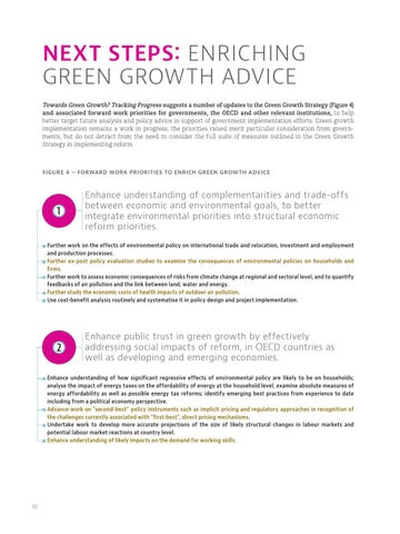 Next steps: enriching green growth advice Towards Green Growth? Tracking Progress suggests a number of updates to the Green Growth Strategy (Figure 4) and associated forward work priorities for governments, the OECD and other relevant institutions, to help better target future analysis and policy advice in support of government implementation efforts. Green growth implementation remains a work in progress; the priorities raised merit particular consideration from governments, but do not detract from the need to consider the full suite of measures outlined in the Green Growth Strategy in implementing reform.