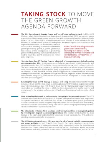 Towards Green Growth? Tracking Progress takes stock of country experience in implementing green growth since 2011. It assesses common challenges experienced by OECD countries and partner economies since 2011 in aligning economic and environmental priorities for green growth. The report seeks to accelerate progress by highlighting where there is broad scope to heighten the ambition and effectiveness of green growth policy, to help countries draw lessons from implementation efforts to date and seize available economic opportunities. Opportunities can arise from the expansion of markets for green technologies and services, improved market confidence from environmental policy clarity, incentives for innovation, efficient management of natural resources and other productivity gains. Revisiting the Green Growth Strategy to enhance well-being. The 2011 Green Growth Strategy recognised green growth policy design as work in progress; OECD work has deepened across the many relevant disciplines since 2011. Towards Green Growth? Tracking Progress surveys the work undertaken and considers the extent to which the Green Growth Strategy can be reviewed and strengthened by the analysis performed, as well as lessons from country implementation efforts to date. Great strides have been made in mainstreaming green growth, but progress is uneven. The OECD has made a concerted and sustained effort to integrate green growth across its work programme; its experience shows that institutional settings matter. To implement green growth, governments will need to drive institutional changes to integrate economic and environmental decision-making, and ensure co-ordination across core policy areas similar to those being implemented by the OECD. That makes the OECDâs experience instructive. The ultimate aim of the report is to accelerate countriesâ implementation of green growth policies by providing more targeted and coherent policy advice. This brochure brings together the main findings of the report, delivered to the OECD Ministerial Council Meeting in June 2015, and corresponding recommendations for governments. The OECDâs Green Growth Strategy fully recognises the role of natural capital in economic growth and human well-being. As such, Towards Green Growth? Tracking Progress forms part of the Organisationâs broader input to major environmental policy milestones, including the United Nations Conference on Climate Change and negotiation of the Post-2015 development agenda, as well as environmental work being undertaken in the context of other international forums, such as the G20.