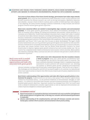countries are taking steps towards green growth; much more determined ef forts are needed to integrate environmental priorities into economic agendas Four years on from release of the Green Growth Strategy, governments have taken steps towards green growth. Most countries have implemented some measures to start to price pollution and provide incentives for efficient resource use, such as pricing instruments, regulatory measures and subsidies. Around a third of OECD countries and a number of OECD partners have adapted, or are adapting, the Green Growth Strategyâs indicator framework, to help evaluate and monitor progress towards national green growth objectives. Much more concerted efforts are needed to meaningfully align economic and environmental priorities. To drive green growth, governments must embed environmental challenges at the heart of economic policy making, by linking environmental and economic reform priorities in a consistent set of objectives. Finance and economic ministries have a major role to play. A number of countries have taken relevant measures, including developing green growth strategies and interministry committees coordinating elements of green growth policy. There are several examples including green growth policies in the United States that emphasise the advantages of technology leadership, and Chinaâs 12th 5-year plan that focuses on green development. Portugalâs Green Growth Commitment sets out 13 quantitative green growth goals to be reached by 2020 and 2030. Irelandâs framework for sustainable development focuses on transitioning to a resource efficient, low-carbon and climate resilient future, and the Nordic Prime Ministerâs Initiative for Green Growth aims to improve regional green growth infrastructure and increase market size. Yet, no country has comprehensively linked environmental and economic reform priorities. Measurability also remains a challenge. Many countries lack data over sufficient time periods to enable effective assessment of policies. OECD advice since 2011 demonstrates that the transition remains a work in progress. Since 2011, green growth considerations have been integrated into the OECDâs core policy advice to countries. The most commonly identified challenges relate to implementing market instruments to price pollution and natural-resource use; orienting tax systems to advance green growth; designing environmentally relevant subsidies; and gearing sectoral policy towards green growth. They are set out in Figure 1. The challenges are not exhaustive and will not necessarily apply to all countries, but demonstrate where main opportunities to improve the effectiveness of green growth policy implementation lie across countries.