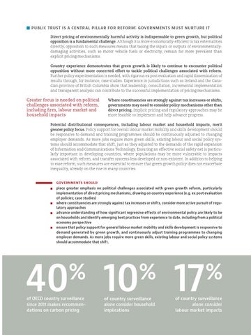 Public trust is a central pillar for reform: governments must nurture it Direct pricing of environmentally harmful activity is indispensable to green growth, but political opposition is a fundamental challenge. Although it is more economically-efficient to tax externalities directly, opposition to such measures means that taxing the inputs or outputs of environmentallydamaging activities, such as motor vehicle fuels or electricity, remain far more prevalent than explicit pricing mechanisms. Country experience demonstrates that green growth is likely to continue to encounter political opposition without more concerted effort to tackle political challenges associated with reform. Further policy experimentation is needed, with rigorous ex post evaluation and rapid dissemination of results through, for instance, case studies. Experience in jurisdictions such as Ireland and the Canadian province of British Columbia show that leadership, consultation, incremental implementation and transparent analysis can contribute to the successful implementation of pricing mechanisms.