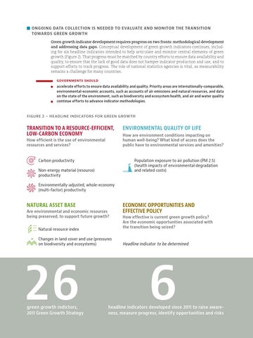 Ongoing data collection is needed to evaluate and monitor the transition towards green growth Green growth indicator development requires progress on two fronts: methodological development and addressing data gaps. Conceptual development of green growth indicators continues, including for six headline indicators intended to help articulate and monitor central elements of green growth (Figure 2). That progress must be matched by country efforts to ensure data availability and quality, to ensure that the lack of good data does not hamper indicator production and use, and to support efforts to track progress. The role of national statistics agencies is vital, as measurability remains a challenge for many countries. Governments should