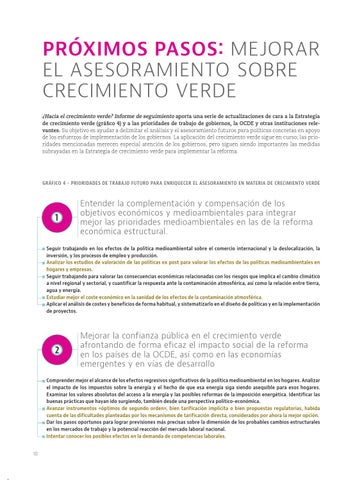 Próximos pasos: mejorar el asesoramiento sobre crecimiento verde ¿Hacia el crecimiento verde? Informe de seguimiento aporta una serie de actualizaciones de cara a la Estrategia de crecimiento verde (gráfico 4) y a las prioridades de trabajo de gobiernos, la OCDE y otras instituciones relevantes. Su objetivo es ayudar a delimitar el análisis y el asesoramiento futuros para políticas concretas en apoyo de los esfuerzos de implementación de los gobiernos. La aplicación del crecimiento verde sigue en curso; las prioridades mencionadas merecen especial atención de los gobiernos, pero siguen siendo importantes las medidas subrayadas en la Estrategia de crecimiento verde para implementar la reforma.