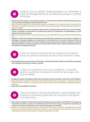 Definir de forma explícita la relación existente entre la Estrategia para el crecimiento verde de la OCDE y la Estrategia para el desarrollo de la OCDE, y mejorar los conocimientos sobre los diferentes tempos y el conjunto de instrumentos de políticas de crecimiento verde necesarios en las economías emergentes o en desarrollo. Incorporar las cuestiones medioambientales al asesoramiento sobre políticas económicas y de gobierno que la OCDE brinda a las economías emergentes o en desarrollo, también en el marco de los procesos relevantes de revisión por pares, la Estrategia de relaciones internacionales y los programas regionales de la OCDE.