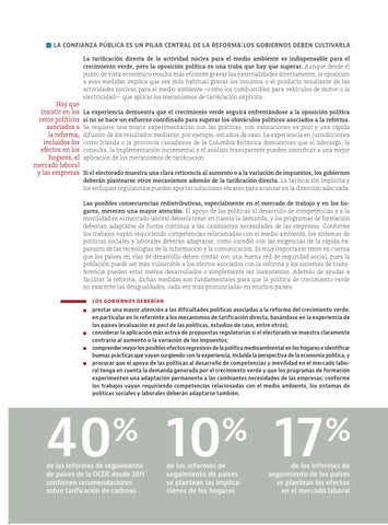 La confianza pública es un pilar central de la reforma:los gobiernos deben cultivarla La tarificación directa de la actividad nociva para el medio ambiente es indispensable para el crecimiento verde, pero la oposición política es una traba que hay que superar. Aunque desde el punto de vista económico resulta más eficiente gravar las externalidades directamente, la oposición a esas medidas implica que sea más habitual gravar los insumos o el producto resultante de las actividades nocivas para el medio ambiente —como los combustibles para vehículos de motor o la electricidad— que aplicar los mecanismos de tarificación explícita.