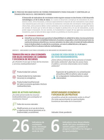 Es preciso recabar datos de forma permanente para evaluar y controlar la transición hacia el crecimiento verde El desarrollo de indicadores de crecimiento verde requiere avanzar en dos frentes: el del desarrollo metodológico y el de la falta de datos. En cuanto al desarrollo conceptual de indicadores de crecimiento verde, está avanzando, y destaca especialmente la fijación de seis indicadores clave (headline indicators) para articular y controlar los elementos centrales del crecimiento verde (gráfico 2). Ahora bien, estos avances deben contar asimismo con los esfuerzos de los países por aportar datos de calidad, de modo que la falta de datos no impida la producción y el uso de indicadores, y para poder seguir avanzando. En ese sentido, es fundamental el papel de las agencias nacionales de estadística, pues la falta de datos sigue siendo un problema en muchos países. Los gobiernos deberían