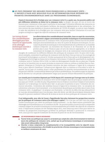 Tourner le dos aux politiques qui, jusqu’ici, ne tenaient pas compte des coûts d’environnement et mettre en œuvre des politiques de croissance verte, sachant que les performances économiques et environnementales seront indissociables à long terme. Chercher à mieux comprendre les complémentarités et les incompatibilités entre les objectifs économiques et environnementaux, afin d’établir les priorités des réformes économiques et environnementales en meilleure connaissance de cause.